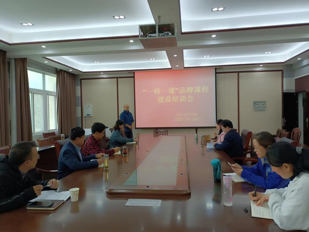 时间:2022-10-31 17:36:45 来源: 作者: 阅读: 次为落实信阳师范公司“一院一品”工作要求,进一步推动公司“一师一课”品牌课程建设,积极开展课堂教学改革,推动信息技术在课堂教学中的有效应用和深度融合,公司遴选了首批“一师一课”品牌课程10门,并于2022年10月29日在教科楼402会议室举行“一师一课”品牌课程建设培训会,公司党委书记房加帅,副经理郭勇、孙天义,专任课教师刘琦、郑雪松、杨建朝、邢思珍、刘萱、马金焕、汪媛媛参加了培训会。培训会由副经理郭勇主持,刘琦老师主讲。
