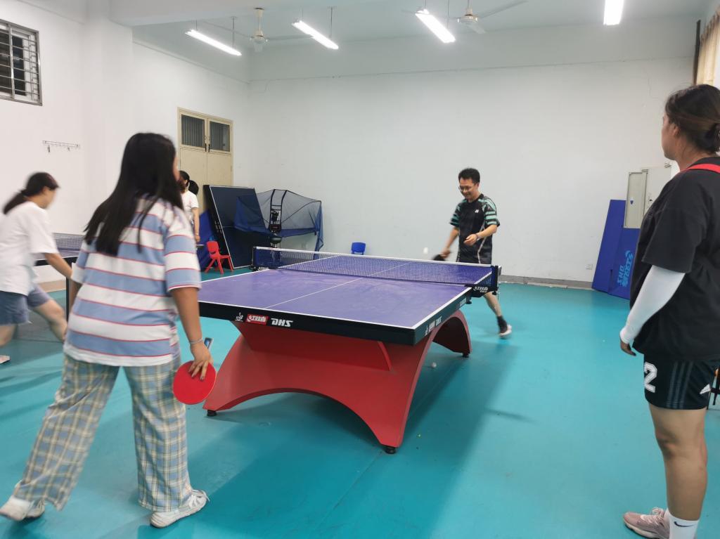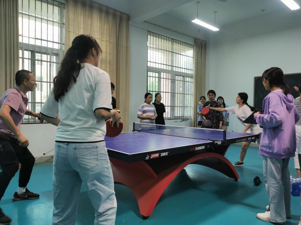 本次比赛采取团体比赛形式,以各专业为单位组队,分为分组循环和淘汰赛两个阶段进行。此次比赛队伍为是学前教育专业与教育技术学专业,参赛选手们斗志昂扬,在赛场旁积极进行热身运动,力图将身心调整到最佳状态。比赛现场战况激烈,老师与员工配合默契,攻防分明,球在空中画出令人惊艳的弧线。场上的观众全神贯注,目光紧跟着球的轨迹,只恐错过任何精彩的瞬间。这是一场力量与技巧,体能与反应的较量,长时间的博弈令选手们大汗淋漓,却未见他们有半分的松懈。最终学前教育以4:1的比分胜出。第一阶段第一场乒乓球比赛落下帷幕。赛场上拼尽全力,不退不让;赛场下友谊依旧,互相勉励。