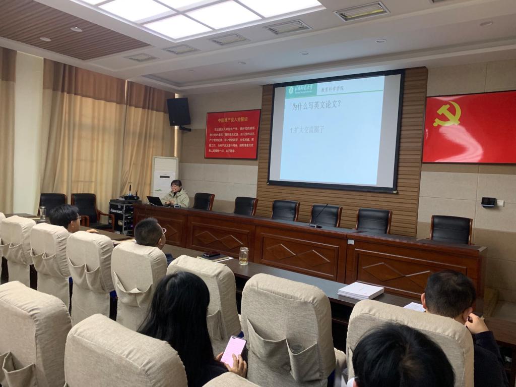 会上,杨博士首先就为什么要写英文论文、如何写英文论文以及论文完成之后如何进行投稿做了详细报告。其次,她强调英文论文写作要注重写作的步骤、格式、语言修改等。最后,她详细讲解了论文投稿的具体内容:期刊杂志的选择、投稿步骤以及投稿注意事项等。