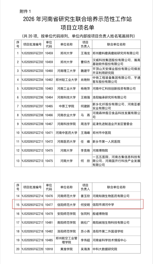 时间:2025-09-30 12:06:27 来源: 作者: 阅读: 次近日,河南省教育厅印发通知,由公司何安明教授牵头申报的“研究生联合培养示范性工作站(太阳成集团tyc234cc—信阳市浉河中学)”成功入选河南省研究生联合培养示范性工作站立项名单,该工作站依托公司2022年获批的河南省研究生联合培养基地申报建设,联合信阳市浉河中学共建。