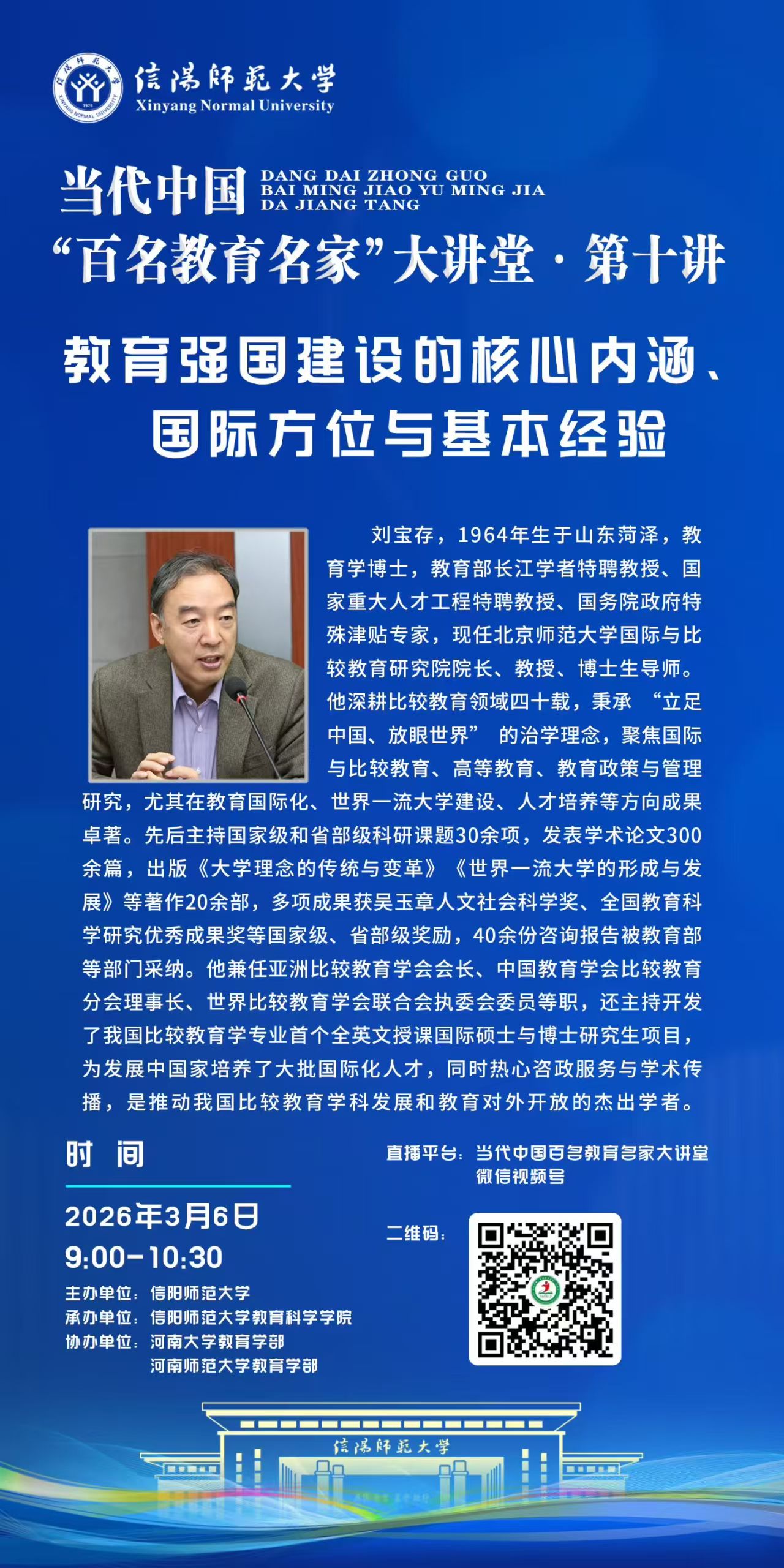 报告人简介:刘宝存,1964年生于山东菏泽,教育学博士,教育部长江学者特聘教授、国家重大人才工程特聘教授、国务院政府特殊津贴专家,现任北京师范大学国际与比较教育研究院经理、教授、博士生导师。他深耕比较教育领域四十载,秉承 “立足中国、放眼世界” 的治学理念,聚焦国际与比较教育、高等教育、教育政策与管理研究,尤其在教育国际化、世界一流大学建设、人才培养等方向成果卓著。先后主持国家级和省部级科研课题30余项,发表学术论文300余篇,出版《大学理念的传统与变革》《世界一流大学的形成与发展》等著作20余部,多项成果获吴玉章人文社会科学奖、全国教育科学研究优秀成果奖等国家级、省部级奖励,40余份咨询报告被教育部等部门采纳。他兼任亚洲比较教育学会会长、中国教育学会比较教育分会理事长、世界比较教育学会联合会执委会委员等职,还主持开发了我国比较教育学专业首个全英文授课国际硕士与博士研究生项目,为发展中国家培养了大批国际化人才,同时热心咨政服务与学术传播,是推动我国比较教育学科发展和教育对外开放的杰出学者。