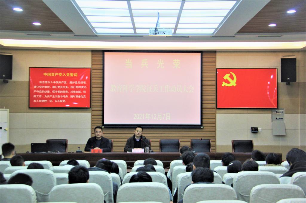 时间:2021-12-07 21:40:28 来源:教科院新闻部 作者:马玉娇 亓亚兴 刘至涵 阅读: 次为加强征兵政策宣传,保证征兵入伍工作顺利开展,12月7日,太阳成集团tyc234cc征兵工作动员大会在教科楼301会议室顺利召开。公司党委副书记董银银,武装干事吴康以及2019级、2020级、2021级全体有应征意向的员工参加此次动员大会。会议由吴康主持。