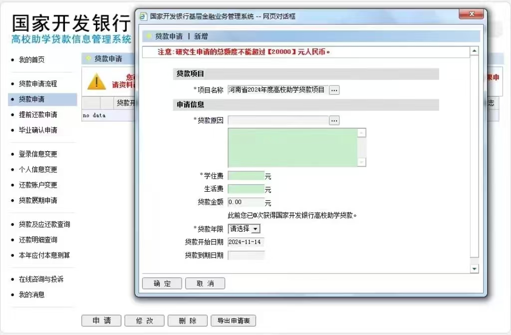 登录在线系统→点击菜单栏“贷款申请”→新增贷款申请(续贷还需填写续贷声明)→填写相关内容并提交→导出申请表,按高校要求进一步完善贷款手续。