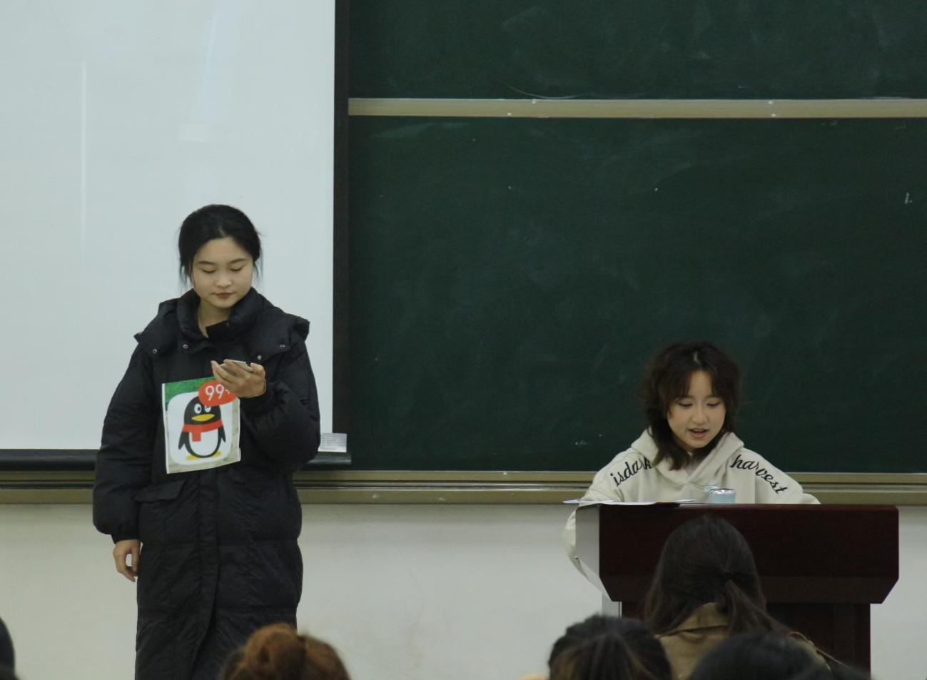 心理学一班员工分为八组,比赛顺序由组长抽签决定,在比赛中,各组分别用PPT、情景剧、新闻主持和角色扮演等形式展现对于心理学知识在服务社会方面的认识。各组内容涉及社会普遍关注的人际关系、外貌焦虑、食品安全等问题。第一组用情景剧“时间都去哪了”讲述人物面对手机各种吸引在时间管理上的挑战,展现心理学知识中认知调整和的体现,告诉我们攀比是一种正常的心理现象,但要更多关注自己内心的幸福感和归属感;第五组用新闻主持以及PPT的方式,将网络热点“被‘伪精致’掏空的年轻人”和心理现象结合,强调了因缺少外界的认同感,年轻人在网络空间精心打造自我形象寻求某种价值肯定,引导年轻人关注现实自身发展,在追求外在精致的同时更关注内心精神世界的精致;第八组以真实感人的心理情景剧将社恐形象展现得淋漓尽致,社交恐惧是一种情感挑战,但朋友的鼓励像光一样照耀他们灰暗的世界,使他们具有迈出一步向前进步的勇气与力量。
