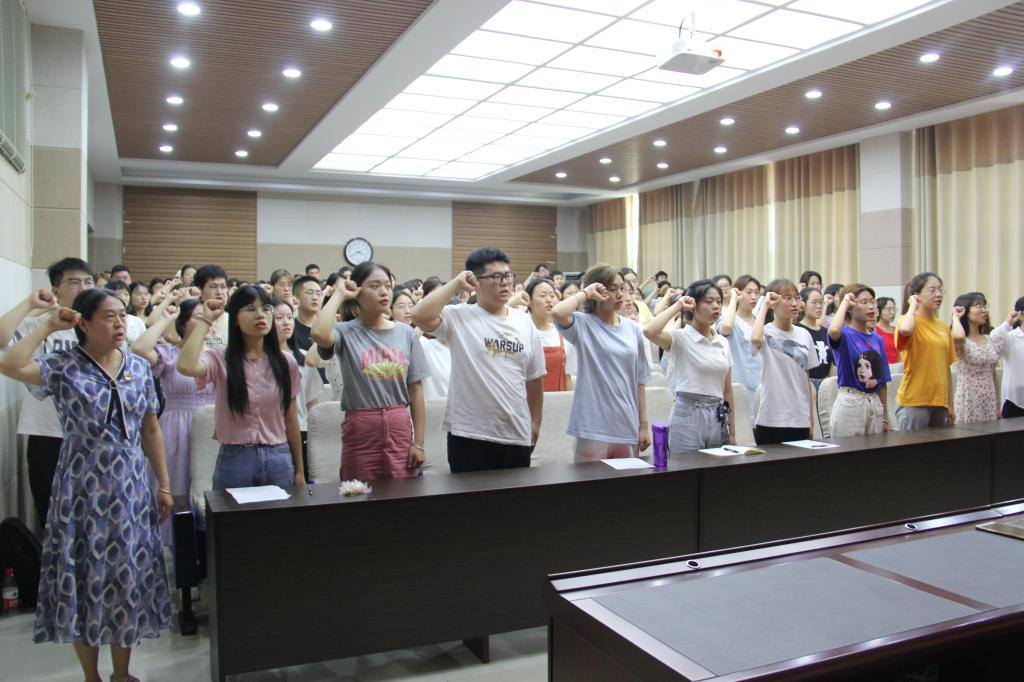 大会在庄严的《国际歌》中开始,张纪娥宣读新发展党员名单,李贵杰副书记领誓,全体党员面对党旗,高举右臂紧握右拳,庄严宣誓,激昂的宣誓声表达了对党的热爱与忠诚。