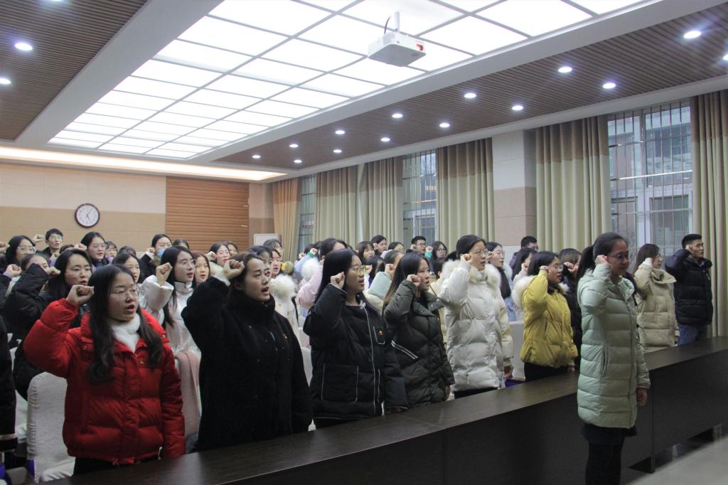 在田园老师带领下,全体新接手预备党员面对党旗庄严宣誓。铿锵的入党誓词响彻教室: