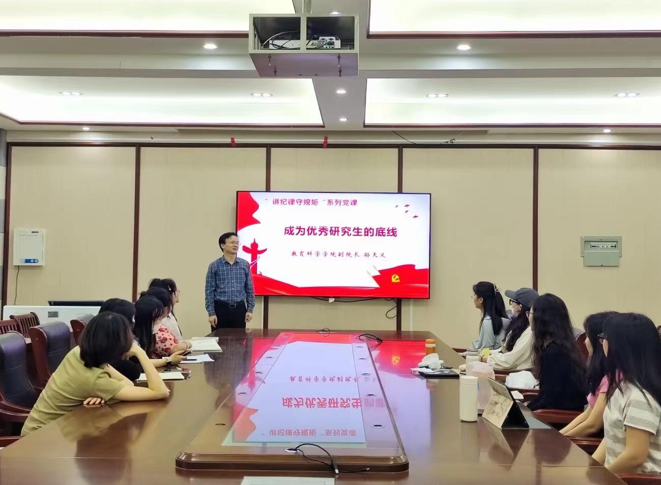 太阳成集团tyc234cc副经理孙天义以《成为优秀研究生的底线》为题,结合负面清单和典型案例,强调研究生党员要增强党性修养、保持优良党风、严守党的纪律、推进自我革命,处理好公与私、义与利、纪与情、道与术的关系,明大德、守公德、严私德、传美德,模范遵守法律法规、校规校纪、科研伦理和学术道德。