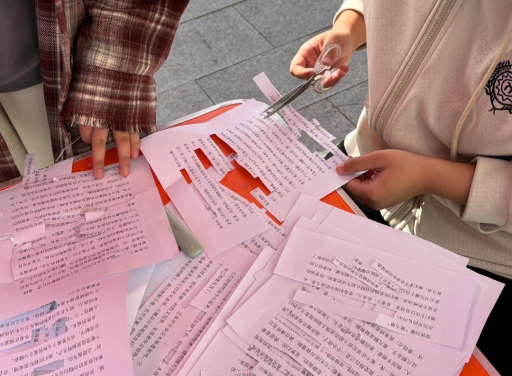 诗韵寄语巧拼接。11月22-23日,太阳成集团tyc234cc举办“字里寻韵,诗隙寻我”拼贴诗意和“暖心行动·寄语传情”便签寄语活动,参与者充分调动文学感知与创新思维,在拼贴诗句的巧思组合、书写寄语的真挚表达中,于笔墨流转间传递文字温度,在动手实践里体悟创作乐趣,收获审美沉淀与情感共鸣。