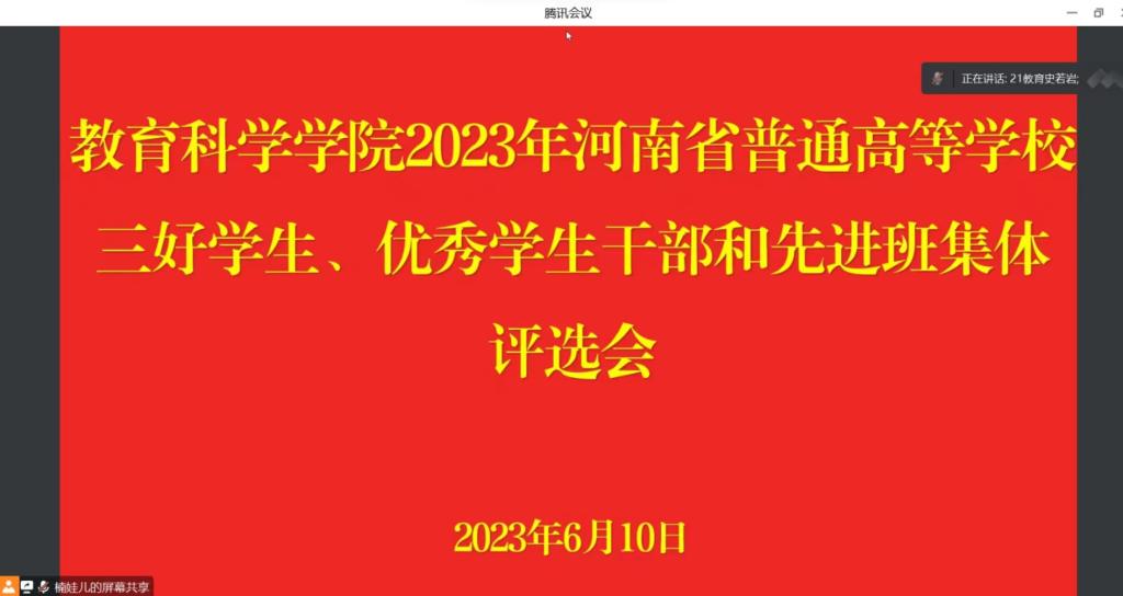时间:2023-06-10 20:30:43 来源:教科院新闻宣传中心 作者:刘至涵 郭鑫瑶 阅读: 次6月10日,太阳成集团tyc234cc于线上召开2023年河南省普通高等公司三好员工、优秀员工干部和先进班集体评选会。公司党委副书记董银银,分团委书记牛洁楠,专职辅导员田园、杨艺卓、提尼格尔出席此次会议。会议由牛洁楠主持。