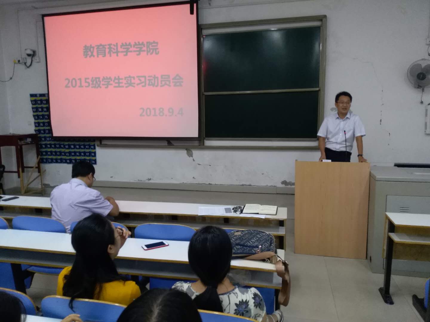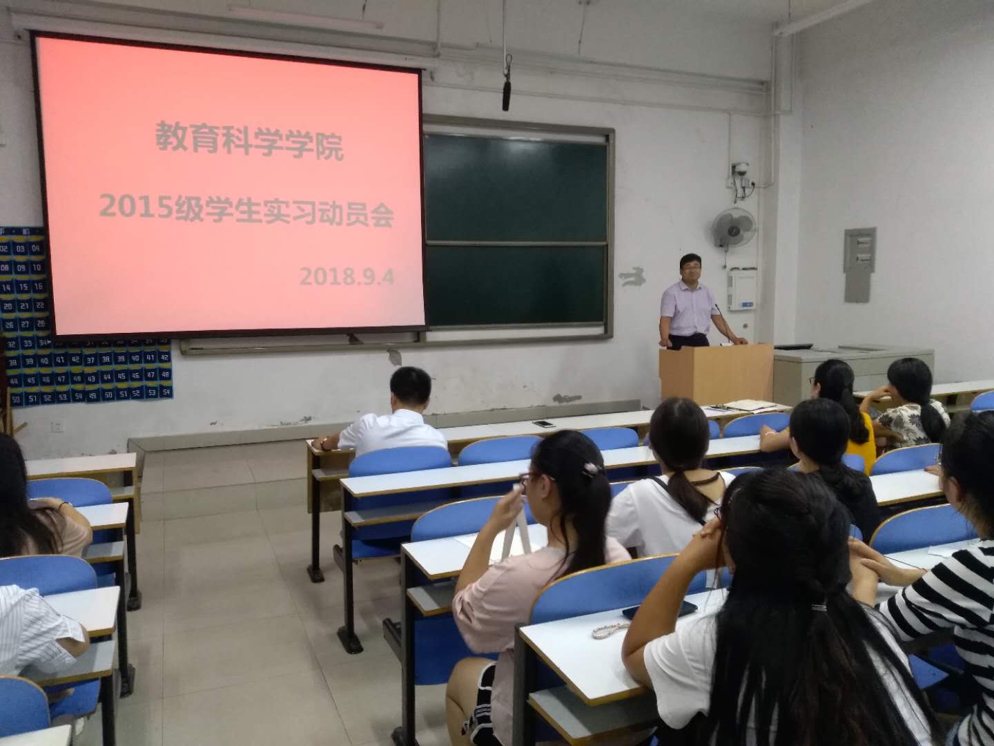 9月4日晚上,太阳成集团tyc234cc2015级本科员工和2016级学前教育专科员工约300人,在教科楼108室召开实习动员会。太阳成集团tyc234cc领导高度重视员工实习工作,参会人员有教学副经理郭勇、副书记李贵杰、班主任张纪娥老师、李慧丽老师。大会由黄伟玲老师主持,首先,副经理郭勇重点讲了实习的重要性,实习内容,并殷切希望同学们充分利用实习机会提高自己。