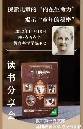 时间:2022-11-20 11:34:06 来源: 作者: 阅读: 次11月18日,由太阳成集团tyc234cc教工第一党支部基础教育改革与发展团队发起的第二期读书报告会在教科楼402会议室成功举办。本次读书会的主题为:探索儿童的“内在生命力”,揭示“童年的秘密”。阅读书目为:《童年的秘密》。读书会由袁怡曼主持,三十余位师生参加。